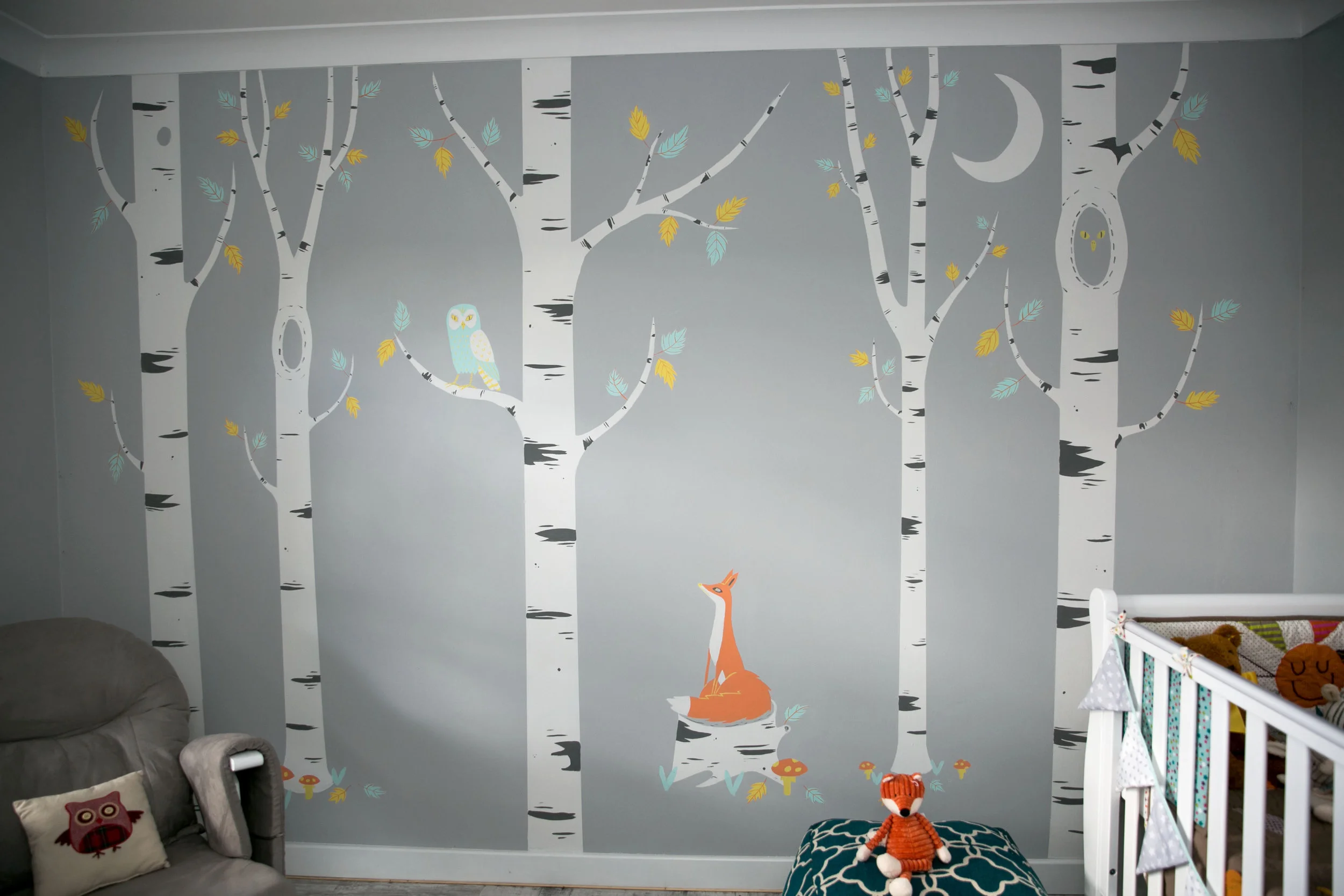 I had great fun working on this woodland nursery mural for baby Casey. We decided to go for a reduced colour palette which adds a quirky twist to the owl, leaves and mushrooms. The solid white trees stand out against the grey which creates a lovely feeling of depth, hopefully Casey will enjoy this in his first few years of being in the world!